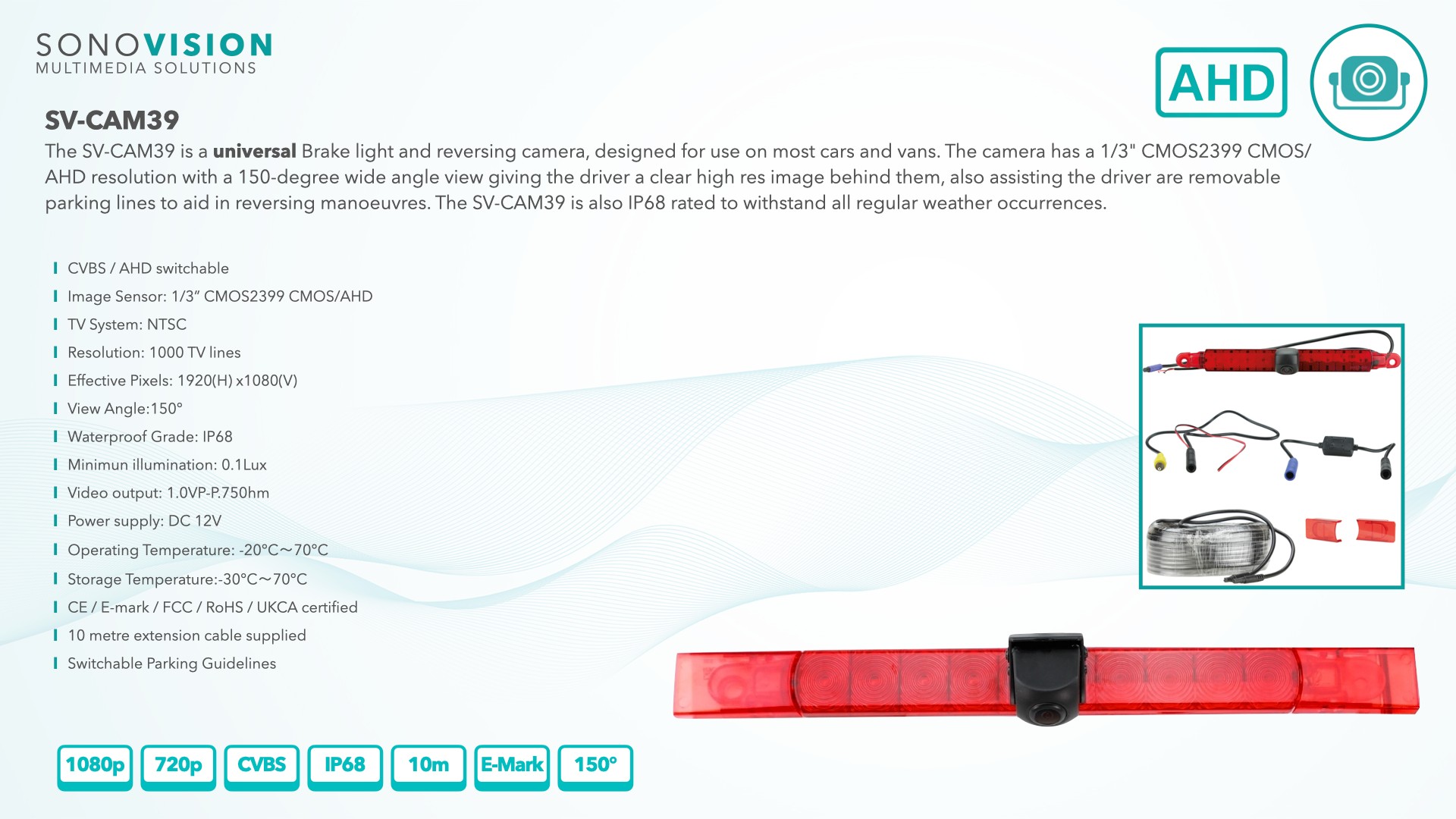The SV-CAM39 is a universal Brake light and reversing camera, designed for use on most cars and vans. The camera has a 1/3" CMOS2399 CMOS/AHD resolution with a 150-degree wide angle view giving the driver a clear high res image behind them, also assisting the driver are removable parking lines to aid in reversing manoeuvres. The SV-CAM39 is also IP68 rated to withstand all regular weather occurrences.