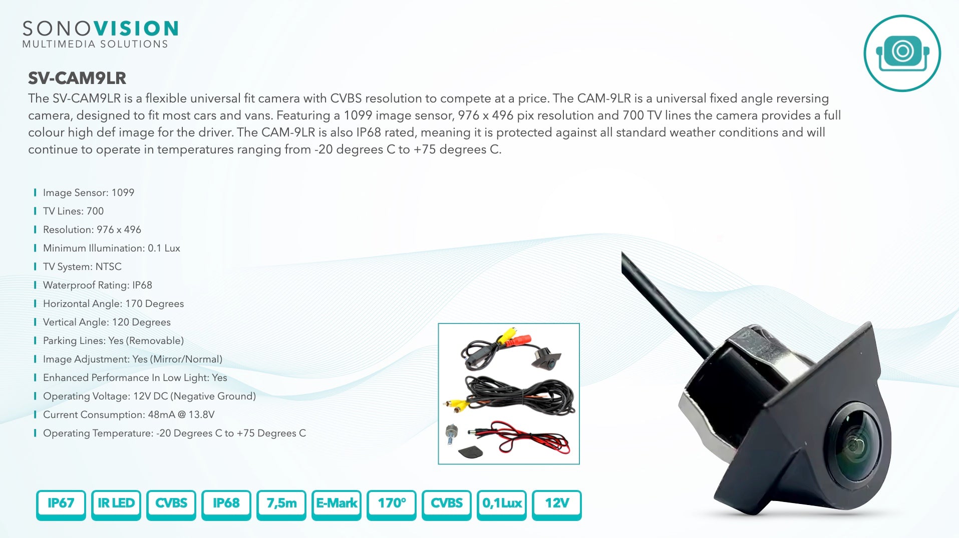 The SV-CAM9LR is a flexible universal fit camera with CVBS resolution to compete at a price. The CAM-9LR is a universal fixed angle reversing camera, designed to fit most cars and vans. Featuring a 1099 image sensor, 976 x 496 pix resolution and 700 TV lines the camera provides a full colour high def image for the driver. The CAM-9LR is also IP68 rated, meaning it is protected against all standard weather conditions and will continue to operate in temperatures ranging from -20 degrees C to +75 degrees C.