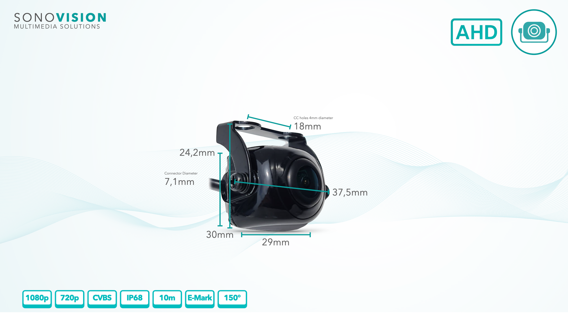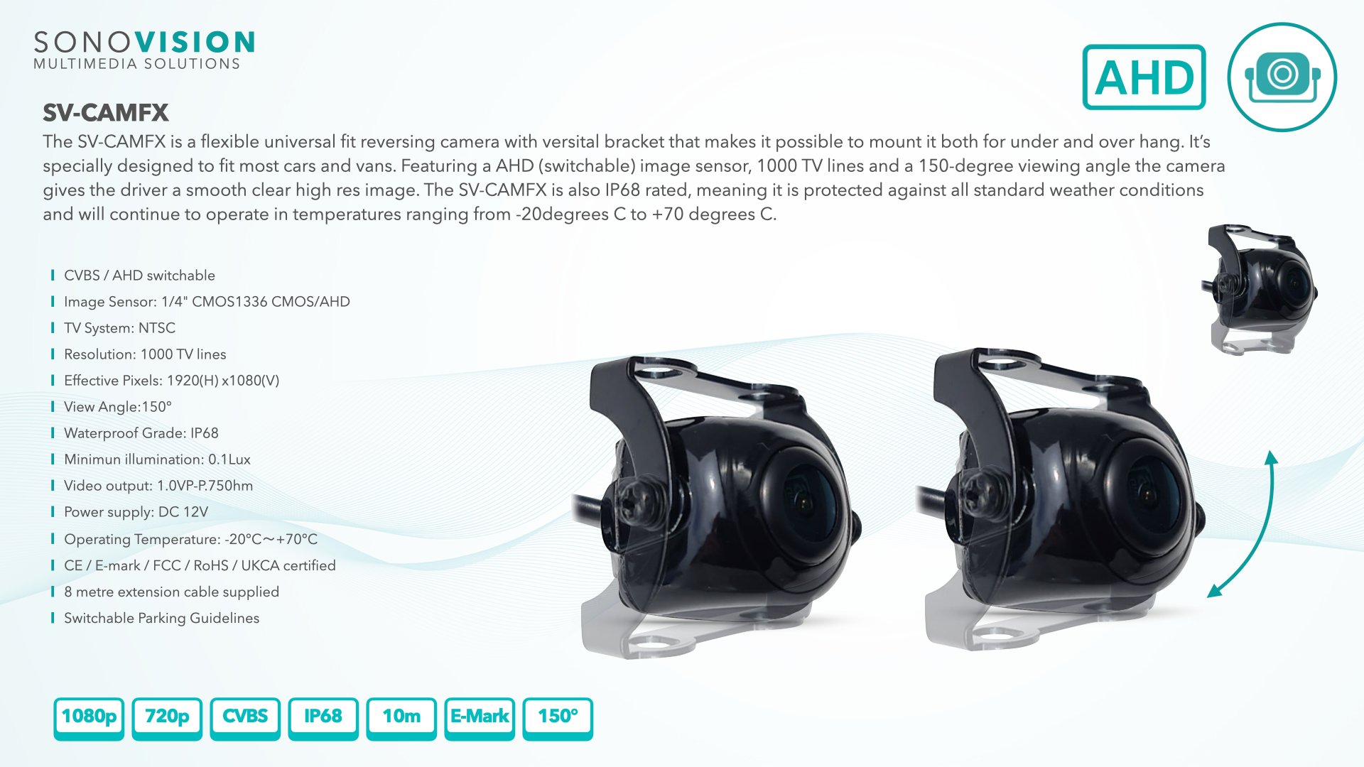 The SV-CAMFX is a flexible universal fit reversing camera with versital bracket that makes it possible to mount it both for under and over hang. It’s specially designed to fit most cars and vans. Featuring a AHD (switchable) image sensor, 1000 TV lines and a 150-degree viewing angle the camera gives the driver a smooth clear high res image. The SV-CAMFX is also IP68 rated, meaning it is protected against all standard weather conditions and will continue to operate in temperatures ranging from -20degrees C to +70 degrees C.